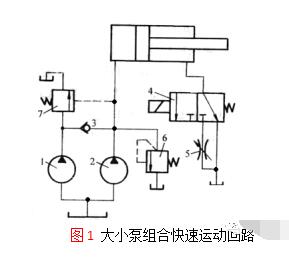 圖1中,泵2為高壓小流量泵,流量按最大工作進(jìn)給速度選擇,工作壓力由溢流閥6調(diào)節(jié)。泵1為低壓大流量泵,兩泵流量加在一起按快進(jìn)時所需的流量來選擇。